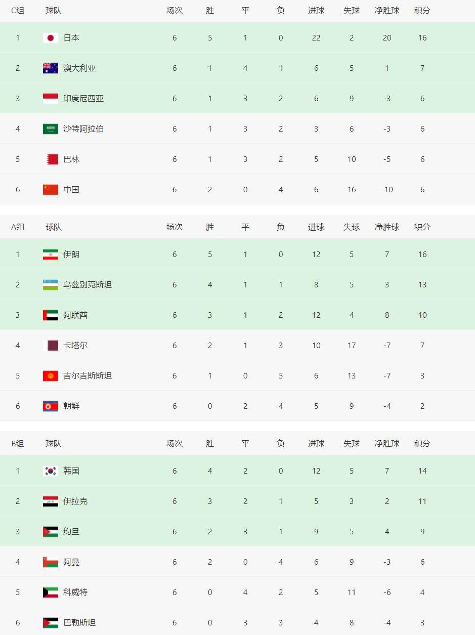 同样身处东亚地区的中国国家足球队则相对乐观,尽管在六轮比赛中也仅积累了6分,暂处小组垫底,但他们与小组前两名的差距仅为1分,若能在净胜球上追平第四名的沙特队,则不论是直通世界杯还是进入附加赛,国足都有一线希望。