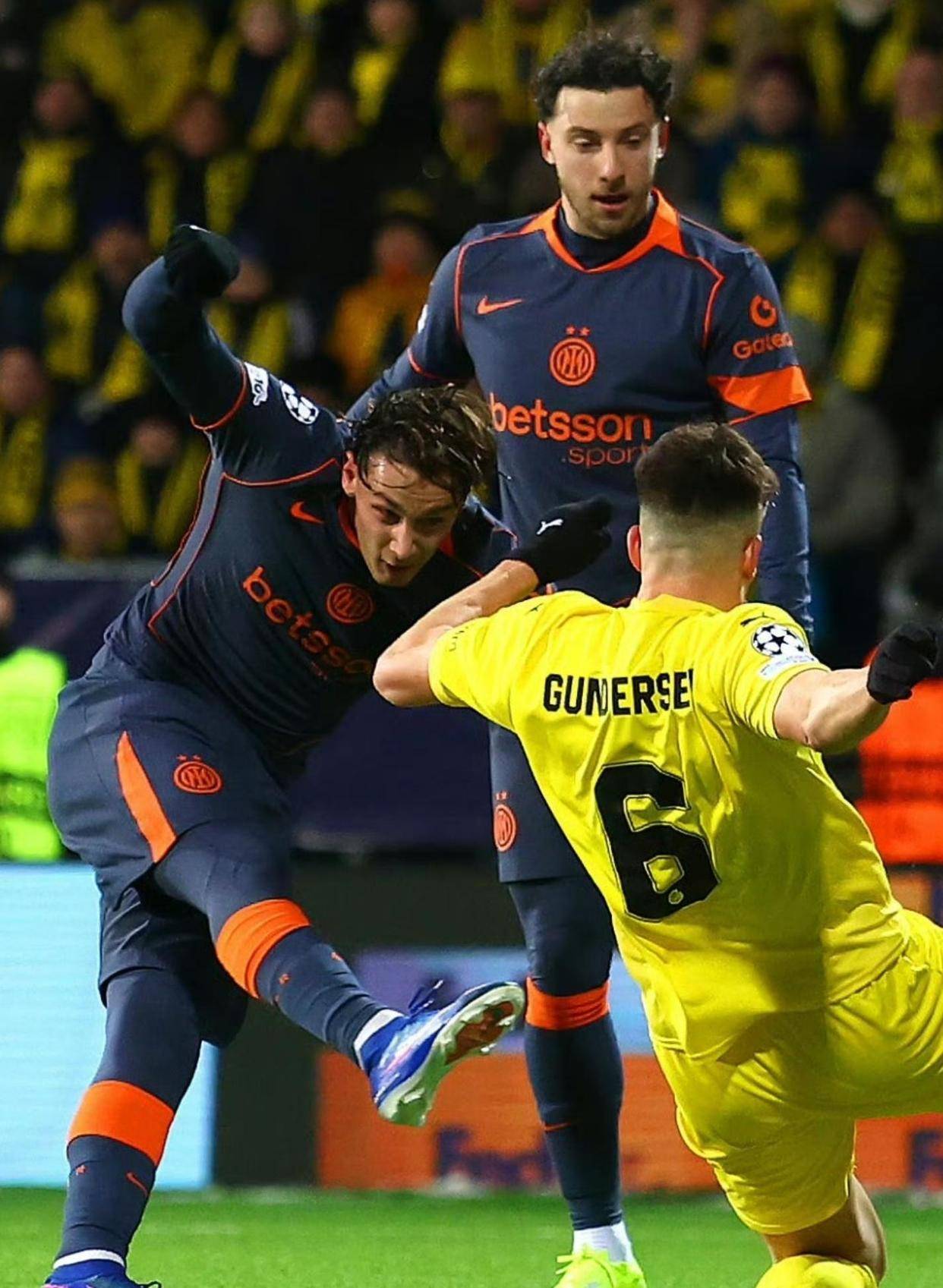 比赛一开始挪威人就压着打,国米后防和中场之间老有空档。 达米安有脚射门打中门柱,但整体上国米办法不多。 博德闪耀的传球又快又准,国米球员在人工草皮上显得笨重。