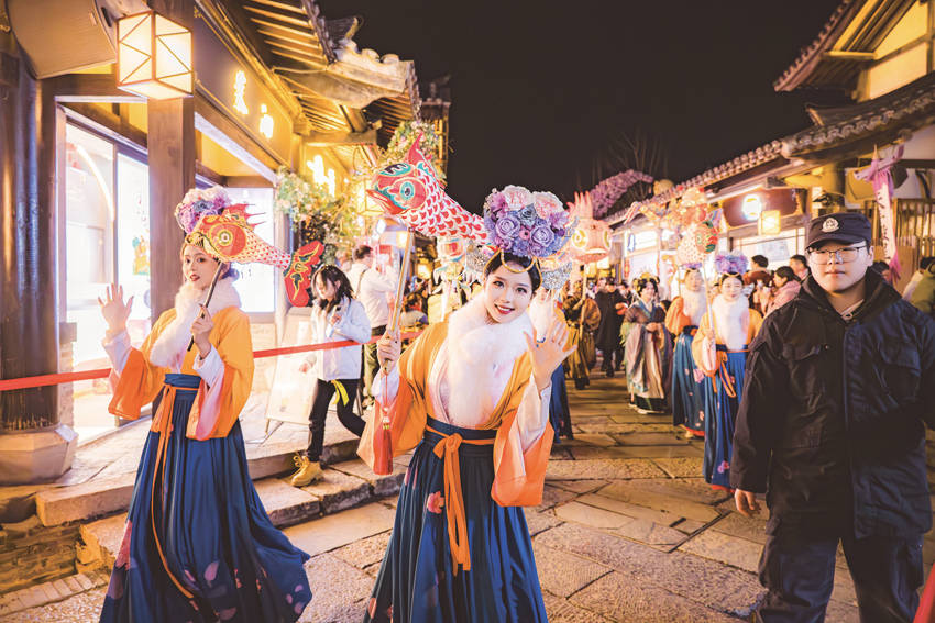 白天看非遗杂技,夜晚赏流光溢彩。上个周末,南通启唐城沉浸乐园内,游客络绎不绝。在25万平方米唐风建筑集群的布置下,景区将唐代的历史人文和民间故事融入到演艺项目中,通过NPC互动和剧本任务推动游客自主探索。一早扮上唐装直奔“长安”街头的谢女士告诉记者:“我们很早就在小程序上订好票,在网上听说有200多个真人NPC,实在不想错过。刚刚我们才和李白、杜甫、神策军汤镇等角色互动过,我家小朋友来了也不想走。”